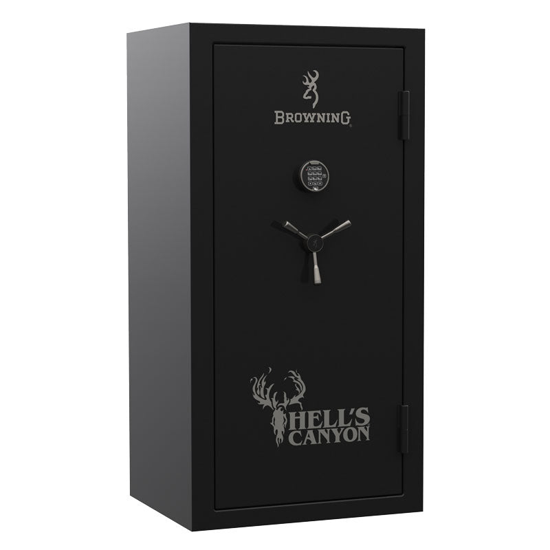 As spacious as its name suggests, the Hell's Canyon can keep all your valuables safe‚ locked behind 11-Gauge steel, hardened steel pin lock protection, and Pry-Stop End Bolts. Enjoy American-made craftsmanship, top-of-the-line security technology, adjustable shelving, and for the finishing touch, sleek black chrome hardware.