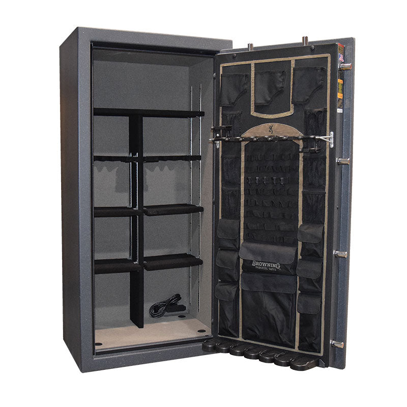You'll be ready to master every hunt with a superior storage system crafted right here in America. Confidently store up to 49 long guns behind a 12-Gauge steel body, nine 1‚ a chrome locking bolts, a Force Deflector Locking System, and more premium security features. With adjustable wood shelving and a Quick Access Barrel Rack, the hunt never has to wait.